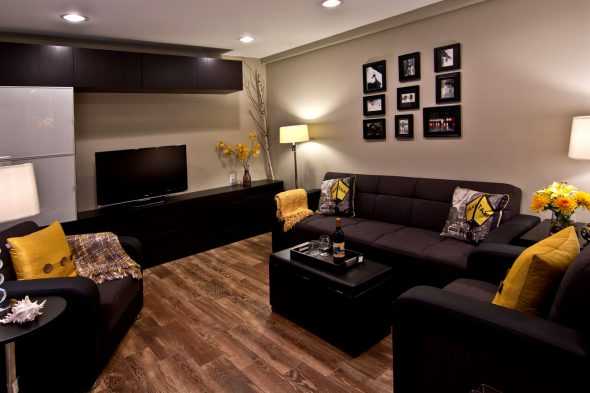 Наиболее часто встречаемый вариант интеграции черного цвета в интерьер гостиной посредством меблировки – это использование темной обивки мягкой мебели.