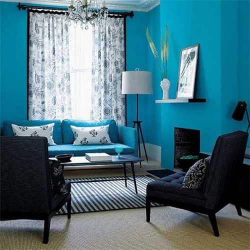 В отличие от предыдущего варианта, этот интерьер яркий, что достигается за счет светлого тона и большого количества света, проникающего в помещение через окна. Здесь мы видим то же самое: резкий переход от темного дивана на ярко-голубой цвет стен: