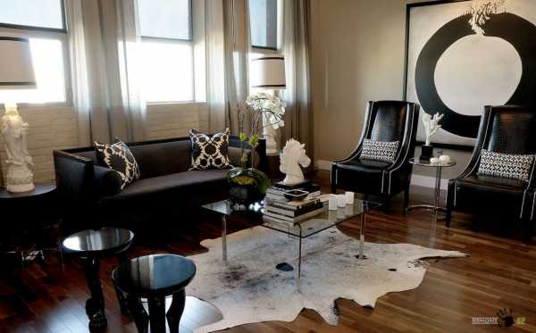 Яркие полоски на подушках, узоры на стенах или шкура зебры на полу способны придать дизайну живую нотку. Интересный вариант – сочетание черной мебели с предметами ярких, сочных цветов – розового, голубого, салатового. Например, стол и комод или полки в сочетании с яркими диваном и креслами.