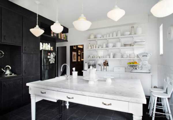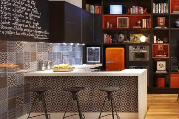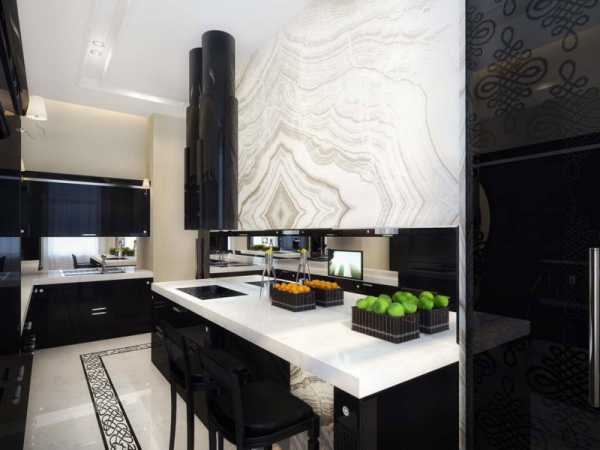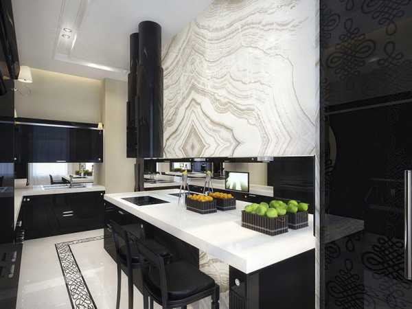 Новизну в дизайн кухни привнесут белые и чёрные цвета, с помощью которых можно нарисовать на полу настоящую шахматную доску. При отделке же стен бело–чёрные ажурные узоры будут смотреться просто восхитительно.