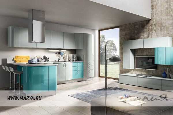 Голубая кухня всегда создает атмосферу прохлады и простора, именно поэтому этот цвет так любят владельцы малогабаритных кухонь в хрущевках. Светлая, синяя гамма как будто раздвигает стенки, превращая потолок в небо. Особенно хорошо такая кухня сочетается с глянцевыми фасадами кухонного гарнитура.