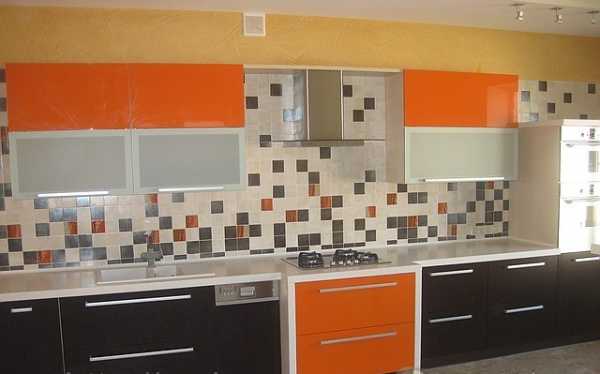 Оранжевый кухонный гарнитур, стена
