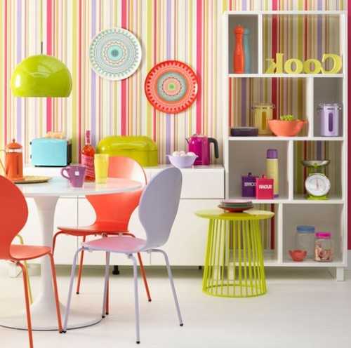Весьма популярны сегодня полосатые обои в оформлении интерьера. Полоски способны исправить недостатки помещения. Для помещений с низкими потолками выбирайте обои с продольными полосами или вертикальным рисунком. Чем уже рисунок, тем выше потолок. Соответственно, если потолки высокие и квартира похожа на колодец, зрительно сравнять высоту потолка поможет поперечный рисунок и горизонтальные полосы.