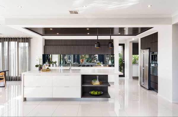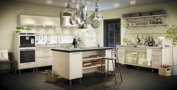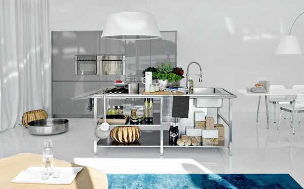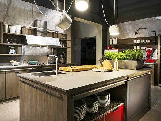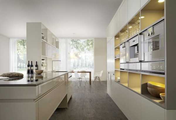 Сегодня многие желают выставить на обозрение стеллажи для хранения различных предметов и полки–витрины. Поэтому производители внесли небольшие изменения и представили вариант кухни, в которой стеллажи и полки максимально открыты. В зависимости от размеров помещения размещаются различные красивые предметы искусства. Главное помнить, что перебарщивать в расстановке такого интерьера не нужно, иначе стильная кухня попросту превратится в миниатюрную свалку.