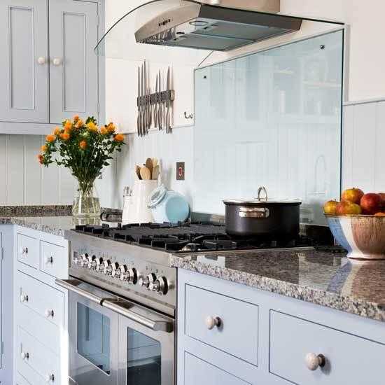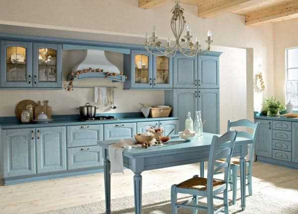Одним из главных недостатков голубого цвета состоит в том, что он очень быстро выгорает и кухня приобретает грязноватый желтый оттенок.
