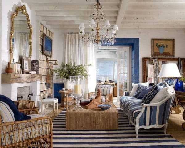 Плетеная мебель, полосатая скатерть и бежево-голубые стены