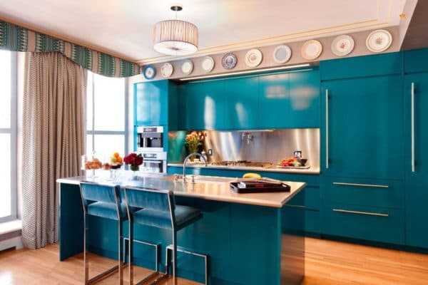 Голубой цвет встречается в кухня в стиле хай-тек, минимализм, современная классика.