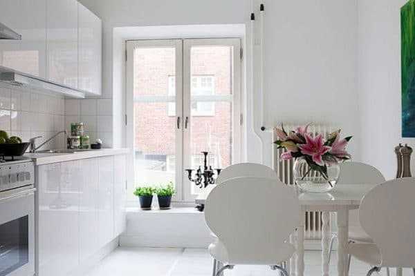 Белый — также универсальный цвет, поэтому хорошо будет смотреться в абсолютно любом стиле: от ампира до минимализма и лофта. Он не надоест, поскольку с помощью аксессуаров, вроде штор и скатерти, легко можно поменять образ всей комнаты.
