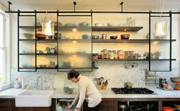 Если открытые полки не очень нравятся, но и закрытые шкафчики тоже не вызывают симпатии, присмотритесь к варианту как на фотографии. Это некий компромисс, ведь при помощи сдвижной перегородки вы всегда сможете сделать шкафчик по своему вкусу