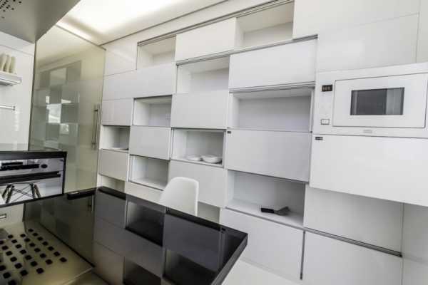 Есть только один спорный момент — маркость. На белом цвете действительно более заметны все капельки, царапинки и прочие недостатки. Но есть выход — выбирать глянцевые фасады: своим блеском они легко спрячут пятна. Тем более белый глянец — самое модное и популярное решение.