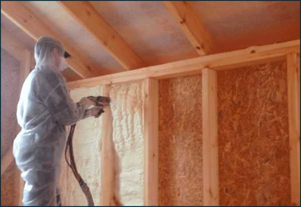 Современная технология утепления — напыление. Специальная машина растворяет полимер и смешивает его с воздухом. Наносят напыляемый утеплитель аналогично пене из баллончика, используют для стен и кровли в коттеджах и каркасных домах.