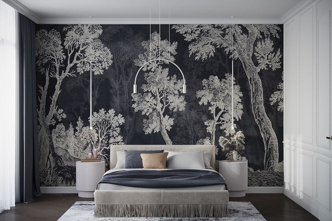 Обои как акцент в черно-белом интерьере спальни