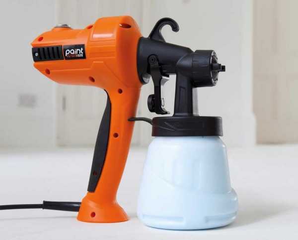 Внешне такой прибор напоминает шуруповерт, но на месте вращающейся головки расположена форсунка, а под ней находится емкость с краской. В корпусе такого прибора установлен насос, нагнетающий давление, необходимое для распыления краски.