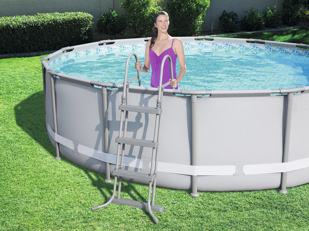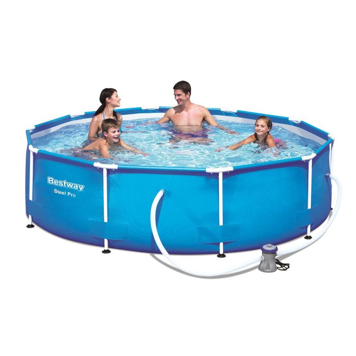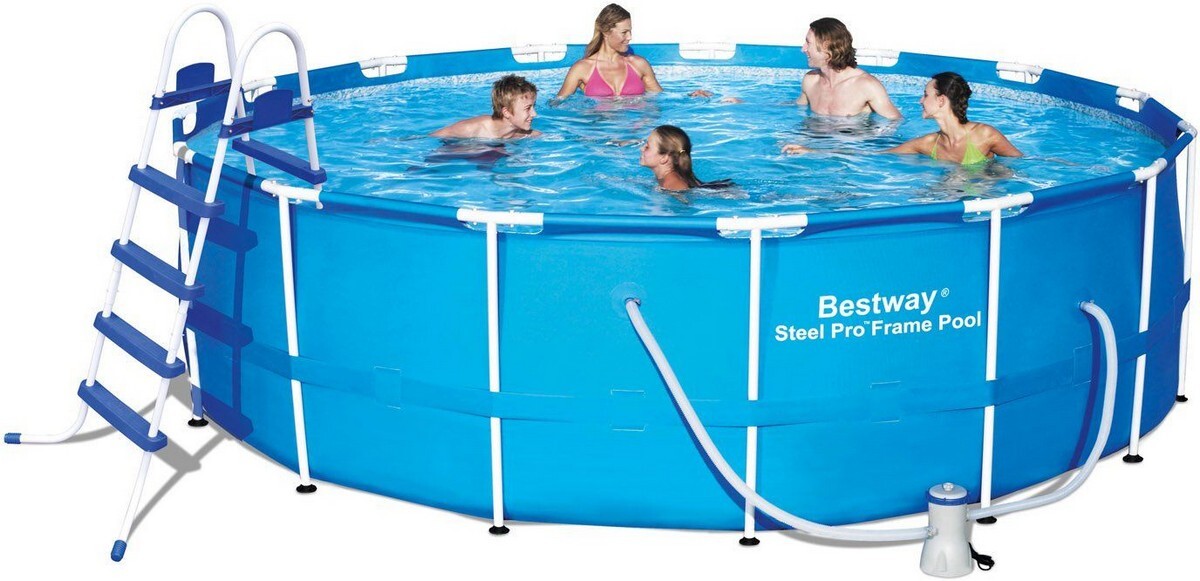 Bestway Steel Pro MAX 56420 с набором серый/синийBestway Steel Pro MAX 56420 с набором серый/синий. Фото: yandex.market.ruКруглый каркасный бассейн с оптимальной глубиной и размером. Чаша изготовлена из трёхслойного полимера, который обладает повышенной прочностью. Материал, из которого сделан каркас – оцинкованная нержавеющая сталь, а значит, владелец может не опасаться появления ржавчины. В комплект входит и лестница для большего комфорта отдыхающих.