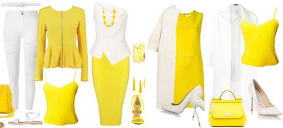 Бело-лимонный в одежде несет в себе ощущение свежести и света. Смотрится женственно и элегантна. Поддержать пару смогут только золотые вещи.