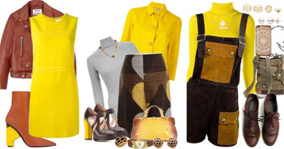 Лимонно-коричневый в одежде – сочная, контрастная гамма. Она будет смотреться более интересной если в ней будут участвовать несколько оттенков коричневого: более серого или желтого. Серый придаст дополнительный шарм палитре.