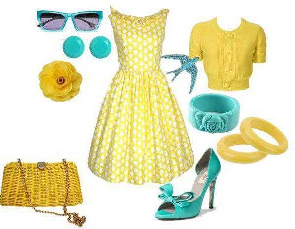 - А на прогулку сочетайте лимонный цвет с нежным голубым. Укороченный кардиган в стиле 50-х, босоножки на шпильке с бантиком — этот образ наполнен кокетством и женственностью.