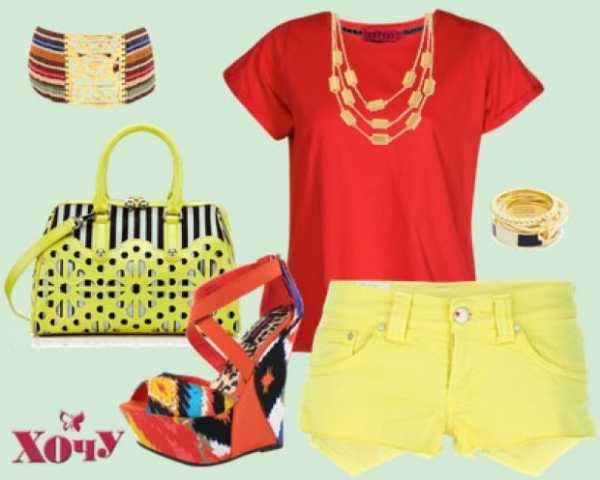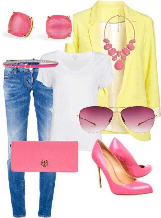 - Хотите чего-то посложнее? Тогда рискните и смешайте в одном наряде лимонный и ярко-розовый цвет. Белая футболка и потертые джинсы станут лаконичным фоном для более интересных вещей.