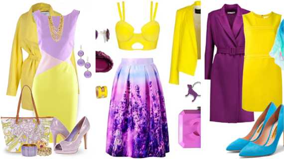 Лимонно-фиолетовый в одежде – шокирующая пара, однако в нему видна законченная гармония. Возьмите на заметку, если вдруг вам понадобится произвести неизгладимое впечатление (возможно только для очень контрастной внешности). Для приглушения вызывающего эффекта подберите более бледные оттенки фиолетового, например бледно-сиреневый.