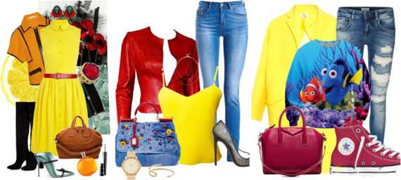 Сложные сочетания с лимонным цветом могу содержать в себе от 3 до 6 оттенков. Одним из самых популярных –образ Белоснежки: сочетание желтого, насыщенно-синего и красного.