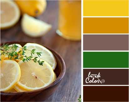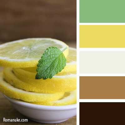 Коричневый цвет как будто передает сладость кислому фрукту, возможно эта ассоциация с шоколадом, а значит и с кондитерскими сладостями. Золотистые тона желтого напоминают медовые переливы, а зеленый предает сочность. Используйте этот вкусный эффект в своем творчестве. В гамме участвуют лимонный, янтарный, светлый оттенок какао, насыщенно зеленый, шоколадный, каштановый.