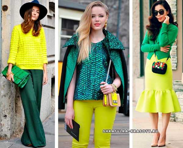 Подбирать оттенки зеленого можно любые, независимо от температуры. Чем спокойнее он, тем контрастнее и ярче станет наряд.