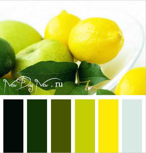Лимонный и холодный зеленый сочетаются в контрастную по теплоте пару, заставляя глаз воспринимать лимонно-желтый еще более теплым и ярким. Чем светлее оттенок холодного зеленого, тем нежнее смотрится сочетание, а более темные тона в такой паре будут требовать поддержки более светлых, иначе контраст будет слишком резким. Палитра включает в себя ментоловый, мятный, изумрудно-зеленый, изумрудный, малахитовый.