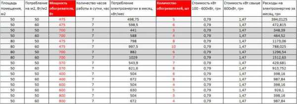 В таблице приведен стандартный расчет электрообогревателейС помощью экономичных обогревателей можно создать эффективные отопительные системы. Чтобы снизить потребление электроэнергии обогревателями производятся следующие мероприятия:
