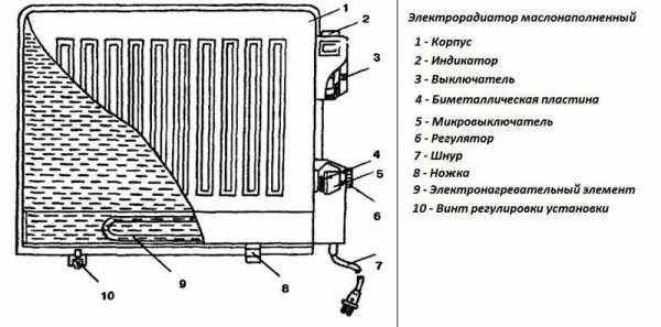 Внутреннее устройство масляной моделиСтоит учитывать, что такой прибор не подходит для маленьких помещений и может быть опасным для детей, так как имеет высокую температуру при нагревании. Нельзя оставлять такой прибор без присмотра. Масляный обогреватель не используется в помещениях, где наблюдается повышенная влажность.