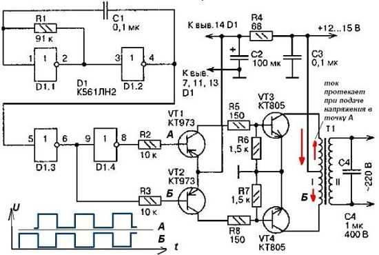 В основу работы инвертора положен принцип широтно-импульсной модуляции (ШИМ). Задающий генератор подает импульсы частотой 10 kHz – 20 Mhz на силовой ключ, подключенный к обмотке высокочастотного трансформатора – с его-то выхода и снимается переменный ток. Ширина импульсов зависит от подключенной нагрузки, поэтому в схеме используют систему обратной связи. Минимальная скважность сигналов соответствует наименьшей мощности, а при повышении токоотдачи ширина импульсов достигает значения 1:1 (максимальное значение).