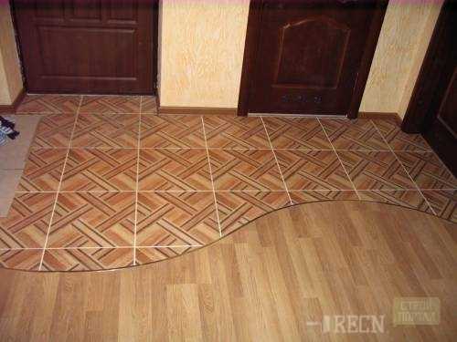 В коридоре плитка хорошо сочетается с ламинатом. Часть пола, на которую приходится наибольшая нагрузка, выкладывается плиткой, остальное застилается ламинатом. Получается практично и уютно.