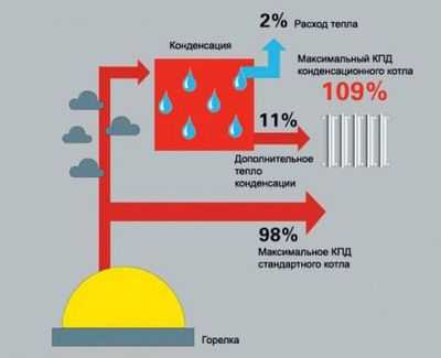 Торговые представители некоторых брендов, предлагая конденсационные теплогенераторы для отопления, используют один маркетинговый ход. Рассказывая о процессе отбора тепла у водяных паров, они декларируют величину КПД агрегата на уровне 109%. Обоснование такое: эффективность стандартного котла равна 98%, а за счет конденсации к ней прибавляется еще 11%. Простой подсчет дает результат в целых 109%. При этом демонстрируется картинка: