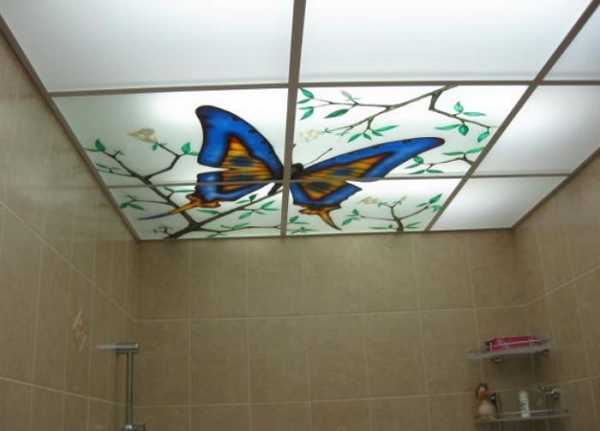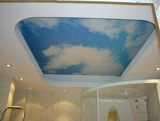 Потолки в ванной комнате могут быть оформлены с помощью цветных покрытий. Оригинальным решением считаются расписные или поверхности с витражами.