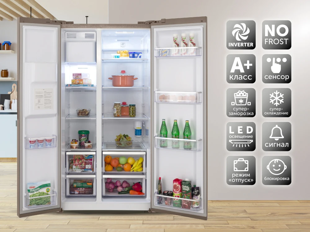 Среди особенностей можно выделить перенавешиваемые двери и функцию «Суперохлаждения». Также отличается стильным дизайном и удобной системой управления.