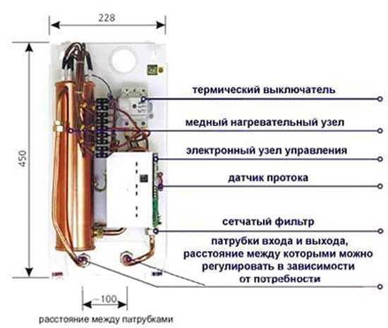 Проточные нагреватели имеют вид и форму змеевика, стенки которого являются мощным нагревателем. Мощность его настолько велика, что вода нагревается до требуемой температуры за то время, которое она движется по конструкции нагревателя. Понятно, что такие нагреватели не требует времени на предварительный разогрев, а отсутствие накопительного бака делает их очень компактными. Правда, такие нагреватели обладают большой электрической мощностью, что является серьезным недостатком.