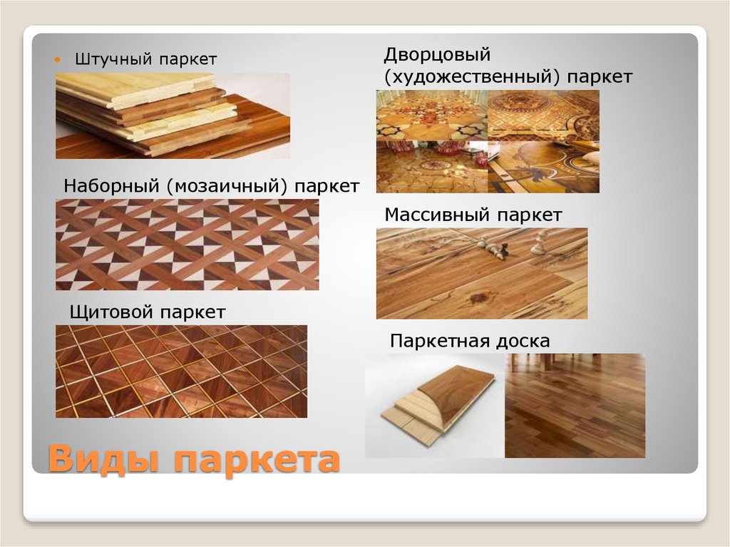 Щитовой паркет в зависимости от видов основания подразделяется на категории: