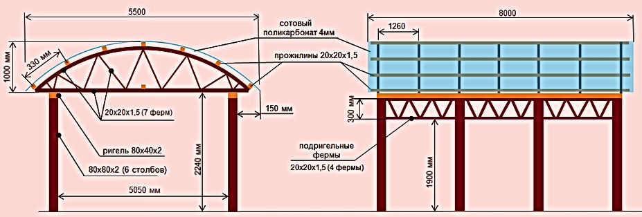 Во-первых, учтите особенности конструкции. Поликарбонат пластичен, из него можно смонтировать полукруглые навесы. Из стального профлиста изготовить дугообразные конструкции сложнее.
