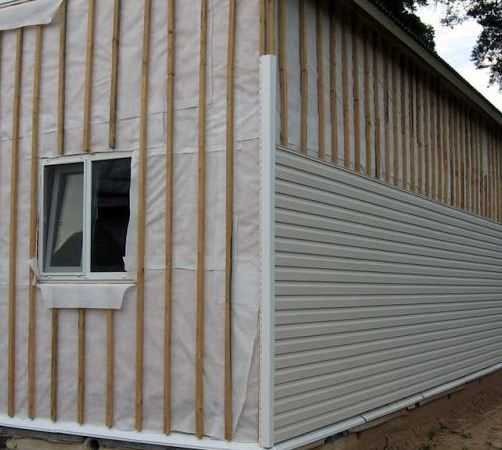 Рейки необходимо закреплять ударными или пластиковыми дюбелями, с учётом плотности стены. На сделанный вертикальный каркас, необходимо устанавливать одну горизонтальную рейку в нижней части фасада с помощью дюбелей или саморезов, независимо от наклонности дома. Каркас под сайдинг необходимо защитить от влаги паронепроницаемой пленкой, благодаря которой весь пар исходит изнутри.