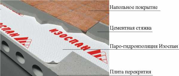 Изоспан С расстилается сверху на утеплитель, необходимо для проветривания оставлять зазор около 50 миллиметров от полотнища до теплоизоляционного материала. В устройстве бетонного пола , тип С расстилается внахлест на бетонную поверхность, затем на полотно укладывается цементная стяжка, и только после этого монтируют напольное покрытие.
