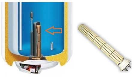 ТЭН для водонагревателя «мокрый» — представляет собой трубчатый электрический нагреватель, состоящий из медной или стальной трубки, в которую концентрично запрессована нагревательная спираль. В качестве теплового проводника и, одновременно, диэлектриком между спиралью и стенкой трубки, служит специальный наполнитель на основе оксида магния (магнезий). При прохождении электрического тока через нагревательную спираль, вследствие ее большого омического сопротивления, практически вся электрическая энергия преобразуется в тепло. Тепло от спирали сквозь изоляционную засыпку передается медной или нержавеющей оболочки тэна, которая и нагревает воду в баке водонагревателя.
