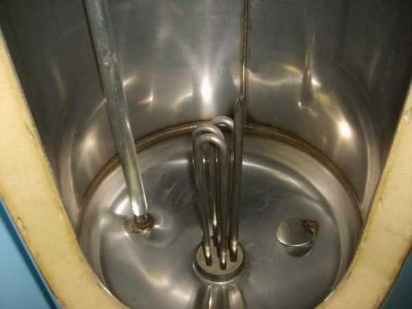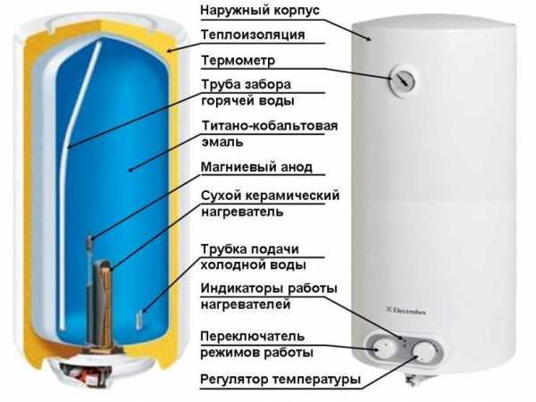 Водонагреватели накопительного типа представляют собой цилиндрической или продолговатой формы бак с расположенным внутри него трубчатым электронагревательным элементом (ТЭНом). Он представляет собой медную трубку, внутри которой находится свернутая спиралью проволока из нихрома, запрессованная в диэлектрик.