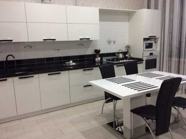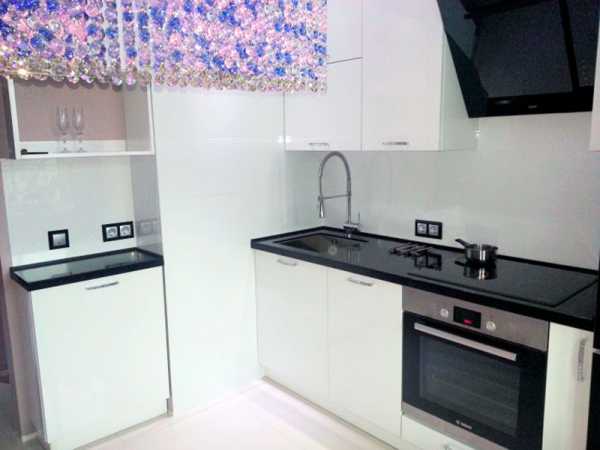 Дизайн фартука в черно-белой кухне площадью 7,5 м2, сделанной в стиле модернизма. За счет использования белой затирки, швов практически невидно.