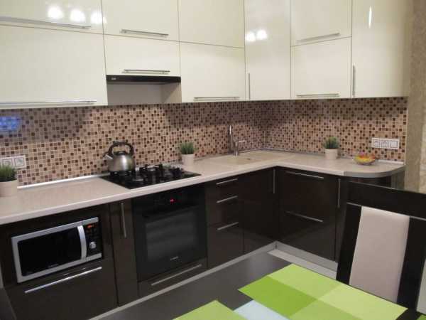 Мозаичная плитка на фартуке кухни будет красивым, но дорогим решением, дешевле будет уложить кафель с её имитацией. К тому же чем меньше швов будет – тем проще будет отмывать поверхность от грязи.