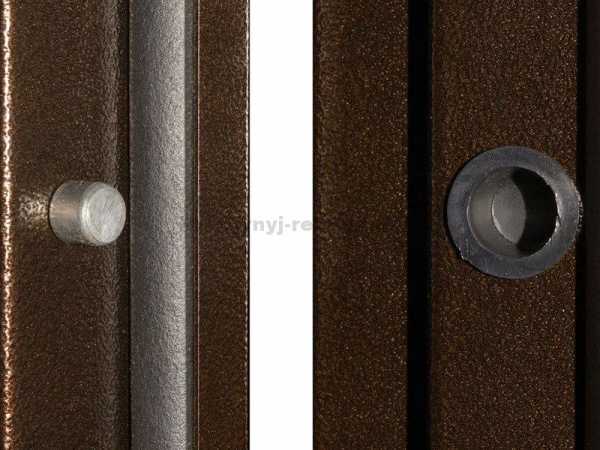 Противосъемные штыри — бонусная устойчивость блока к взлому. Усиливающие пассивные ригели связывают закрытое полотно двери с коробкой. Ригель — выдвигающийся засов цилиндрической формы, выполняющий функцию запирающего механизма. Монтируются со стороны петель на вертикальном профиле коробки или полотна. В случае если замки и петли будут сломаны, дверь не получится ни открыть, ни снять с петель. Штыри удержат дверь на своем месте.