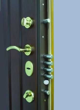 Дверной замок следует выбирать высокого качестваКоробку в современных моделях производят из толстого уголка. Иногда применяется профильная труба. Актуальна покупка дверей, имеющих горизонтальные и вертикальные ребра жёсткости. В пустотах укладываются звукоизоляционное сырье.