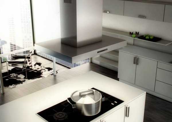 - Островные. Островные вытяжки – имеют мощный мотор и несколько режимов работы. Крепятся к потолку. У данного устройства выделяется многообразие форм: круглая Т-образная, квадратная и прочие. Следует учитывать, что островные вытяжки предназначены для особого дизайна, где есть возможность установить плиту посреди кухонной зоны.