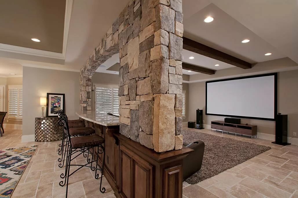 «Каменные» стены создают ощущение стабильности и безопасности. Но важно не перестараться, чтобы комната для вечеров с семьей и друзьями не выглядела как холодный замок.