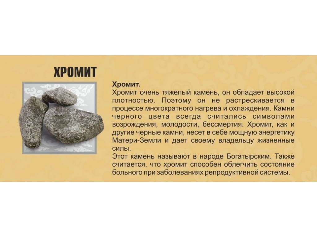 Нетоксичный камень магматического происхождения, очень плотный и прочный – не крошится при перепадах температур. Наши предки считали его камнем молодости и бессмертия, заряжающим энергией и силами, лечащим болезни половых органов, простуды. Хромит не взаимодействует с водой, хорошо держит тепло.