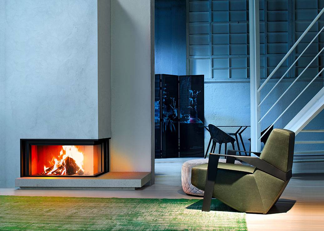 Следует отметить, что угловые камины отличаются изящным дизайном и при этом не занимают много места. Радиальная или призматическая форма стеклянного фасада делает угловой очаг немного выдвинутым в помещение, что позволяет ещё больше увеличить угол обзора. Такие модели могут использоваться как для угловой, так и для фронтальной установки.
