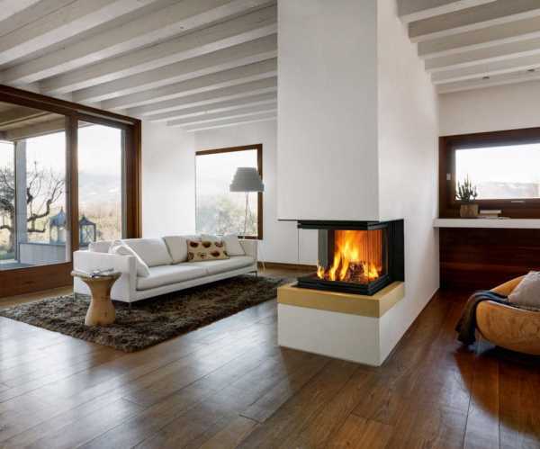 Наиболее симпатичные и популярные каминные конструкции, не занимающие много площади. Местом их установки выступают угловые участки, что не провоцирует загромождения пространства. Дымовая труба при этом может находиться на любой стене, возле которой смонтирован очаг.